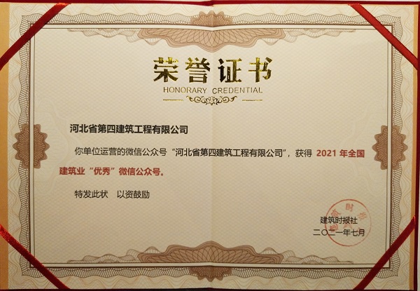 7月16日,在“2021建筑業(yè)微信公眾號運(yùn)維經(jīng)驗(yàn)交流研討會暨全國建筑業(yè)優(yōu)秀公眾號頒獎(jiǎng)典禮”上,公司微信公眾號“河北省第四建筑工程有限公司”被評為“2021年全國建筑業(yè)優(yōu)秀微信公眾號”。