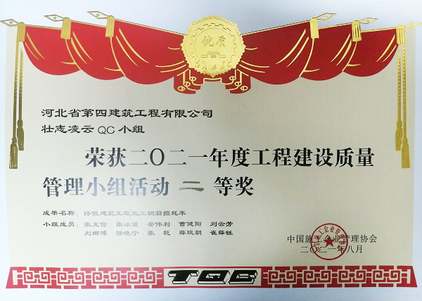 10月中旬,公司收到中國(guó)施工企業(yè)管理協(xié)會(huì)《關(guān)于公布2021年工程建設(shè)優(yōu)秀質(zhì)量管理小組的通知》,在中國(guó)施工企業(yè)管理協(xié)會(huì)工程建設(shè)質(zhì)量管理競(jìng)賽中,七分公司壯志凌云QC小組經(jīng)過(guò)初賽、復(fù)賽、決賽三個(gè)階段比拼,最終榮獲二等獎(jiǎng)。
