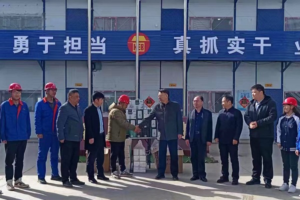 在會議室,唐志強聽取了項目基本情況匯報,詳細了解職工生產(chǎn)生活、勞動防護等方面情況。隨后深入施工現(xiàn)場,查看職工工作環(huán)境并與職工交流,傾聽一線職工聲音。C型料場正在進行擋墻主體施工,他叮囑現(xiàn)場管理人員高度注意安全,防止高空墜落。來到項目辦公區(qū),院內(nèi)墻壁上“誠信守責、勇于擔當、真抓實干、業(yè)績服人”的工作總要求顯得格外醒目,“大家遠離家鄉(xiāng),在一線兢兢業(yè)業(yè),工作辛苦了,我代表公司工會來看望你們……”他向每位職工送上保溫杯、牛奶等慰問品,“內(nèi)蒙古風(fēng)沙大,最近天氣冷,大家一定要注意保暖……”他和職工一一握手問好,并送上殷切關(guān)懷。