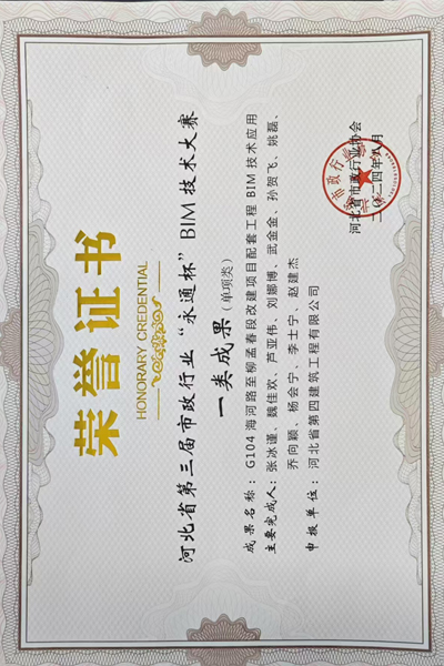 8月16日,七分公司收到了河北省市政行業(yè)協(xié)會頒發(fā)的榮譽證書。分公司參賽的“G104海河路至柳孟春段改建項目配套工程BIM技術應用”成果,在河北省第三屆市政行業(yè)“永通杯”BIM應用技能大賽中被評為一類成果。