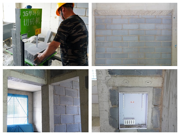 在材料利用與成本控制方面,項(xiàng)目團(tuán)隊(duì)探索出了“更優(yōu)解”。針對頂部斜砌施工,項(xiàng)目部原計(jì)劃采購混凝土預(yù)制塊進(jìn)行砌筑,但在論證中發(fā)現(xiàn)采購的預(yù)制塊存在成本高、運(yùn)輸損耗大、工序銜接慢等弊端。經(jīng)過反復(fù)研討,項(xiàng)目團(tuán)隊(duì)決定就地取材,利用現(xiàn)場加氣混凝土砌塊施工剩余的裁切廢料,通過定型化切割模具進(jìn)行精準(zhǔn)切割,替代外購預(yù)制塊。為保障方案順利實(shí)施,項(xiàng)目部提前抽調(diào)技術(shù)嫻熟的切割工,組織加氣塊切割專項(xiàng)培訓(xùn),同時提前安裝調(diào)試好40余臺高精度切割設(shè)備,現(xiàn)場切割作業(yè)得以高效展開。這一創(chuàng)新方法的運(yùn)用,將加氣塊材料的現(xiàn)場利用率提高到90%以上,其切割面更加平整,有效保障了斜砌質(zhì)量和結(jié)構(gòu)整體性,提升了觀感效果。