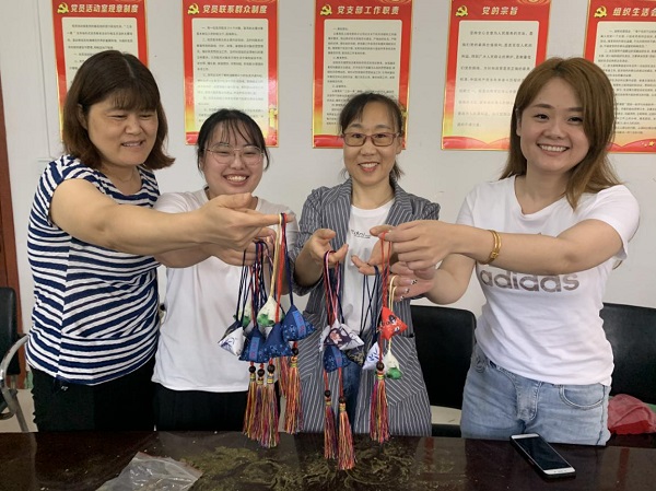 在傳統(tǒng)習俗中,玲瓏可愛的各色香包也是端午節(jié)必不可少的元素。包完粽子后大家轉(zhuǎn)移陣地到了活動室,大家圍坐桌邊,面前堆放著一份份材料包,有棉布、艾草、針線、中國結流蘇。面對這個從來沒有做過的DIY,大家開始研究起來,有的用手機搜索縫制方法流程,有的直接比來比去親自摸索著縫起來。有職工說:“這有點像咱們小時候老人們縫的毽子,那個里面裝的是五谷雜糧,咱們現(xiàn)在裝的是艾草?!薄斑@香囊可以掛在辦公室或者車上,有清香、驅(qū)蚊的功效?!薄拔宜闶侵懒?,這個流蘇應該縫在這個邊的中間,而不是角上……”大家你一句我一句,手中的針線穿梭在棉布間,用密密的針腳縫制出傳統(tǒng)佳節(jié)最好的注解,用絲絲線線纏繞出端午安康的美滿寓意,一個個精巧可愛的三角香囊在大家的努力下完美呈現(xiàn)。