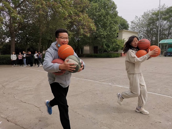 “誰先來?抱球游戲升級——1人抱4個籃球向前奔跑,過程中一個球也不得落地,否則成績無效。”裁判之一的審計科長談增迫不及待地宣布?!皞€子高的胳膊、腿長,有優(yōu)勢,先上?!比巳豪镉腥颂嶙h,工程科身高一米八的帥小伙劉文浩和綜合辦高個子王春影舉手示意,跑道上呈現(xiàn)二人灑脫、漂亮的抱球姿勢。