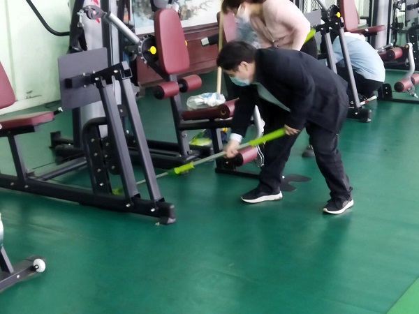 參與活動的20余名同志,分工合作,雖然大家來自不同部門、不同崗位,但爭先恐后、合作默契,清理地面、擦拭健身器材、清潔桌凳?!扒懊娴哪型緜兗佑土耍覀兛熠s上你們了!”負責拖地的九分公司主任經(jīng)濟師劉彩在后面說道?!斑@個乒乓球擋布拿抹布擦拭的效果不太好,用外面的高壓水槍沖洗試試吧!”九分公司主任會計師付世芳一邊用抹布擦拭擋布一邊提出自己的合理化建議,“這個辦法好!”九分公司綜合辦公室主任張路平同意道。
