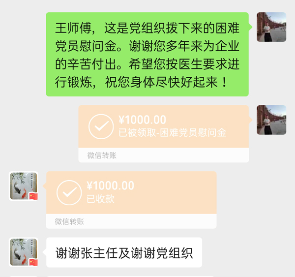 “現(xiàn)在身體怎么樣?生活可有什么困難?”因受疫情影響,不能對所有困難黨員和困難職工實(shí)現(xiàn)入戶走訪,公司黨委和工會(huì)就通過電話一一聯(lián)系,仔細(xì)詢問他們疫情防控期間生活情況、身體健康狀況,根據(jù)他們的實(shí)際情況,將慰問金通過微信轉(zhuǎn)賬發(fā)給個(gè)人,米面油等慰問品能送到小區(qū)門口的送到小區(qū)門口,能送到工地的送到工地。