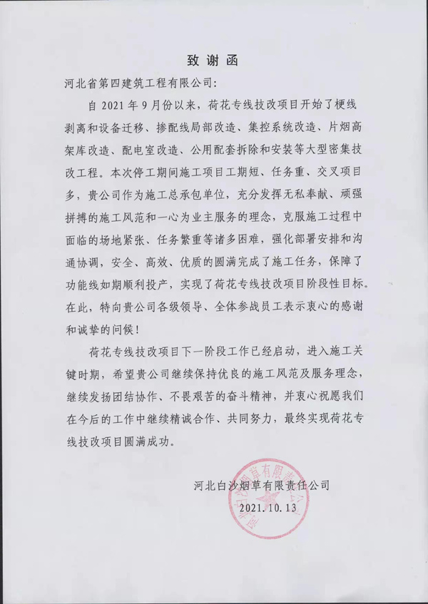 一紙致謝函,字字鼓人心!10月13日,三分公司中煙項目部收到業(yè)主河北白沙煙草有限責任公司發(fā)來的致謝函,感謝項目部克服場地緊張、任務重等諸多困難,圓滿完成施工任務,實現(xiàn)了荷花專線技改項目階段性目標。