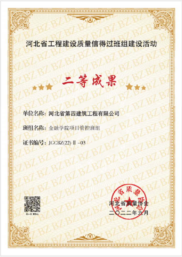 9月16日,六分公司收到了河北省質(zhì)量協(xié)會頒發(fā)的證書,河北金融學(xué)院項目管控班組榮獲“河北省工程建設(shè)質(zhì)量信得過班組建設(shè)活動”二等成果,并被推薦到中國建筑業(yè)協(xié)會交流。