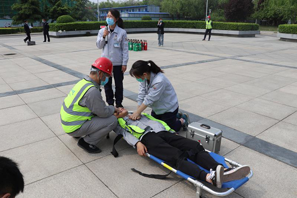 上午10點(diǎn),消防救援支隊(duì)講解員對(duì)全體人員進(jìn)行消防安全知識(shí)培訓(xùn),詳細(xì)講解了防煙面罩正確佩戴方法、疏散逃生要領(lǐng),以及滅火器的使用方法和注意事項(xiàng)。10點(diǎn)半左右,演練正式開(kāi)始,施工現(xiàn)場(chǎng)三區(qū)二層濃煙滾滾,“著火了,著火了¨¨¨”項(xiàng)目安全員在現(xiàn)場(chǎng)巡查時(shí)發(fā)現(xiàn)火情高聲呼喊,周圍施工人員迅速拿滅火器進(jìn)行滅火,項(xiàng)目經(jīng)理張玉賓接到險(xiǎn)情后馬上通知義務(wù)消防隊(duì)員滅火并組織緊急疏散。大家用濕毛巾捂住口鼻,俯身低頭按照演練逃生路線快速?gòu)默F(xiàn)場(chǎng)撤離到演練集合區(qū)。在大家撤離火災(zāi)現(xiàn)場(chǎng)的同時(shí),救援組孫杰、楊克、董擁軍等人把傷員抬到通風(fēng)處,他們?cè)卺t(yī)療救護(hù)組的指導(dǎo)下,用雙手拍打傷者雙肩并呼叫他的名字、用觸摸頸動(dòng)脈等方法斷傷者是否喪失意識(shí),并進(jìn)行心肺復(fù)蘇。心肺復(fù)蘇演練時(shí),按壓胸部是最有效也是最常用的辦法,施救人員首先在傷者兩乳頭連線中間,胸骨中下三分之一處找準(zhǔn)按壓點(diǎn),然后用手掌根部緊貼傷者胸部,兩手重疊,五指相扣,手指翹起,肘關(guān)節(jié)伸直,用上身重量垂直下壓30次,經(jīng)過(guò)救治傷者最終蘇醒,整個(gè)搶救過(guò)程有條不紊,最后藁城區(qū)消防救援大隊(duì)長(zhǎng)張海寧對(duì)應(yīng)急預(yù)案演練進(jìn)行了點(diǎn)評(píng),此次火災(zāi)應(yīng)急預(yù)案演練圓滿結(jié)束。