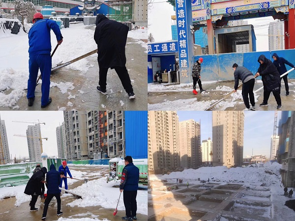 由于本輪低溫降雪持續(xù)時(shí)間較長(zhǎng),整個(gè)施工現(xiàn)場(chǎng)積雪不僅厚還很瓷實(shí),清掃工作十分困難。寒風(fēng)凜冽刺骨,但大家熱情高漲,充分發(fā)揚(yáng)不怕苦、不怕累的精神,黨員干部帶頭,職工群眾踴躍參加,按照分工好的清掃區(qū)域全面鋪開(kāi)進(jìn)行。設(shè)備管理員系上安全帶爬上塔吊,清理積雪,先后對(duì)各類機(jī)械設(shè)備進(jìn)行維修保養(yǎng),檢查是否存在安全隱患;電工按照巡檢路線展開(kāi)防寒防凍措施檢查,并對(duì)臨電周邊積雪進(jìn)行清理;其他管理人員掃的掃、鏟的鏟、相互配合,清除辦公區(qū)及生活區(qū)積雪;在施工區(qū)域,各分包隊(duì)伍清理道路積雪,對(duì)1#、2#、6#、10#住宅樓各層采取冬季保暖措施,并對(duì)門窗逐個(gè)進(jìn)行封閉;項(xiàng)目經(jīng)理帶隊(duì),加強(qiáng)現(xiàn)場(chǎng)巡護(hù),落實(shí)落細(xì)各項(xiàng)安全措施,確保雪后順利復(fù)工。經(jīng)過(guò)大家一個(gè)上午的通力合作,高質(zhì)高效地完成了掃雪除冰工作,確保重點(diǎn)區(qū)域沒(méi)有積雪結(jié)冰,切實(shí)保障了項(xiàng)目有序運(yùn)行。